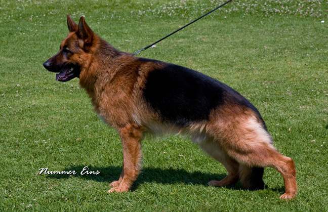 Groß, kräftig mit lobenswertem Gepräge. Sehr guter Kopf, sehr gute Ober- und Unterlinie, korrektes Höhen- Längenverhältnis. Sehr gute Winkelungen, gerade Front. Ausgewogene Brustverh...Read more